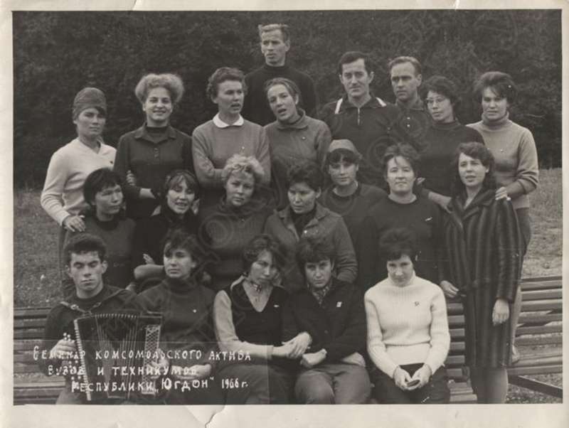 —//— | Участники республиканского семинара комсомольского актива вузов и техникумов. 4-й справа в 1-м ряду сверху - второй секретарь Ижевского горкома ВЛКСМ Юрий Иванович Копысов. | ~1966 г. | позитив, фотобумага, удовлетворительное | |