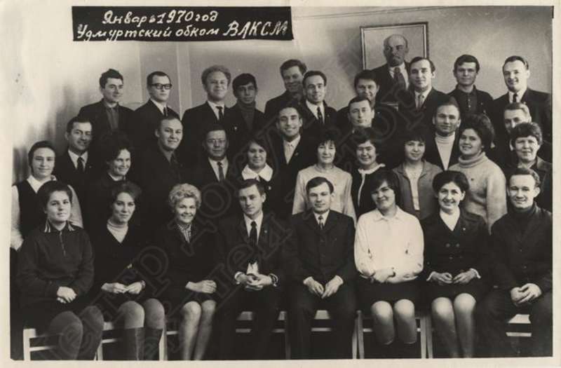 —//— | Сотрудники Удмуртского обкома ВЛКСМ. 2-й слева во 2-м ряду - секретарь-заведующий отделом пропаганды и культурно-массовой работы обкома комсомола Юрий Иванович Копысов. | ~январь 1970 г. | позитив, фотобумага, удовлетворительное | |