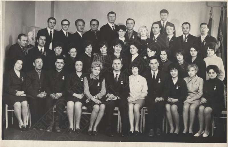 —//— | [Работники Удмуртского обкома ВЛКСМ с передовиками народного хозяйства, награжденными медалью "За трудовую доблесть. В ознаменование 100-летия со дня рождения В.И. Ленина"]. 2-й слева во 2-м ряду - секретарь - заведующий отделом пропаганды и культурно-массовой работы Удмуртского обкома ВЛКСМ Юрий Иванович Копысов, сидит 6-й слева - первый секретарь Удмуртского обкома ВЛКСМ Юрий Петрович Кудяшев. | ~апрель 1970 г. | позитив, фотобумага, удовлетворительное | |