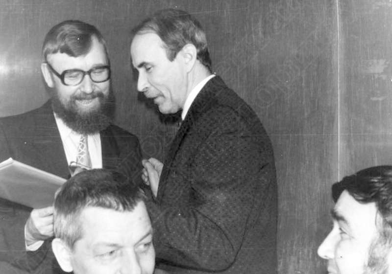 —//— | В.А. Журавлев (1-й справа, стоит), Председатель Верховного Совета УР В.К. Тубылов (4-й слева) на [научной конференции в УдГУ]. | ~1993 г. | позитив, фотобумага, удовлетворительное | |