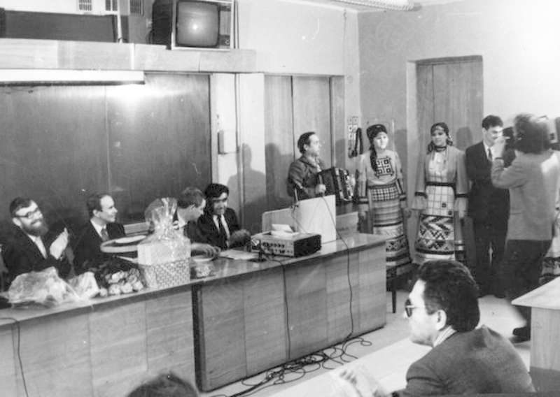 —//— | Выступление фольклорно-этнографического студенческого ансамбля "Чипчирган" на научной конференции в [УдГУ]. Президиум конференции. Слева направо: доктор исторических наук, профессор В.Е. Владыкин, ректор УдГУ В.А. Журавлев, кандидат исторических наук, доцент УдГУ В.А. Кананин, профессор Г.А. Ушаков | ~1993 г. | позитив, фотобумага, удовлетворительное | |