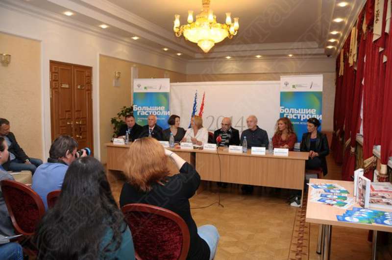 Коллекция фотодокументов | Пресс-конференция, посвященная гастролям московского театра "Эрмитаж" в Удмуртии в рамках программы "Большие гастроли", организованной под эгидой Министерства культуры РФ, в Государственном национальном театре УР. Участники пресс-конференции. Общий вид зала | 3 сентября 2014 | JPEG, эл.ф/док., диск, хорошее |